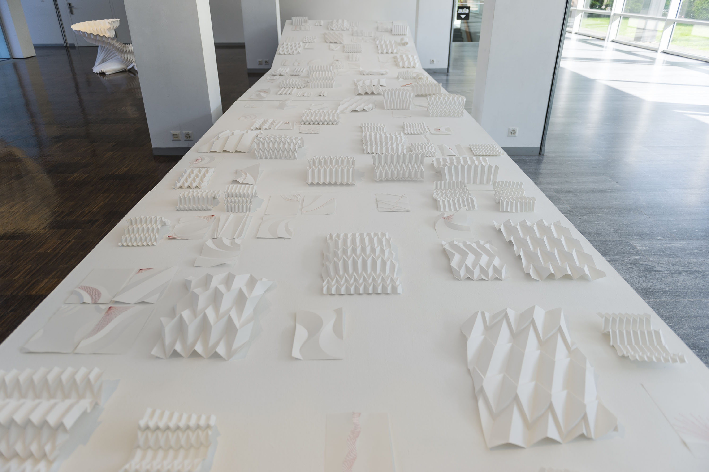 Les élèves des classes de préapprentissage artistique présentent les travaux réalisés dans le cadre d’un workshop sur le thème du pli. Une infinité de plis donnent volume et forme à des feuilles habilement rainées. Des objets qui fascinent à la fois par leur rigueur et par leur fantaisie.